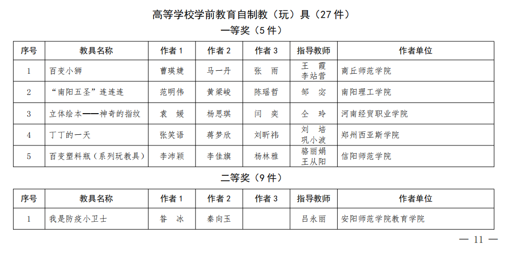 近日,河南省教育厅公布了第十九届河南省中小学幼儿园自制教(玩)具暨学生科技创新小制作小发明评选活动获奖名单,我院首次参赛的2件作品均获佳绩。其中,2020级学前教育本科2班李沛颖、李佳旗、杨林雅的作品《百变塑料瓶(系列玩教具)》(指导教师:骆丽娟、王从阳)获高等学校学前教育自制教(玩)具组一等奖,2020级学前教育本科1班赵越月、张琳洁、美日古丽?吾拉音的作品《皮影戏<司马光砸缸>》(指导教师:骆丽娟、王从阳)获二等奖。