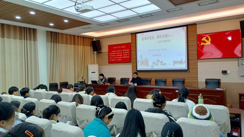 时间:2023-12-02 15:19:37 来源: 作者: 阅读: 次2023年12月2日上午,信阳市春华学校副校长李秀娟应邀在教科301,为我院2021级本科生做了题为《志当大先生、做好引路人--谈实习那些事》的报告。教育学、教育技术学专业学生在现场聆听了报告,学前教育和心理学专业学生在线上聆听了报告。