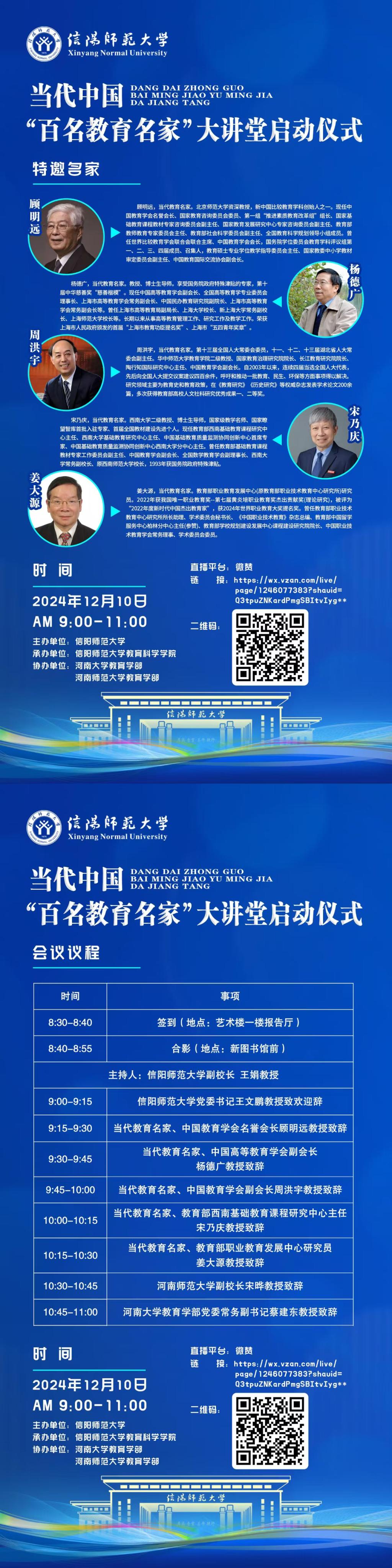 教育是国之大计、党之大计。为扎实推进教育高质量发展,加快建设教育强国,信阳师范大学拟于12月10日举行当代中国“百名教育名家”大讲堂启动仪式。