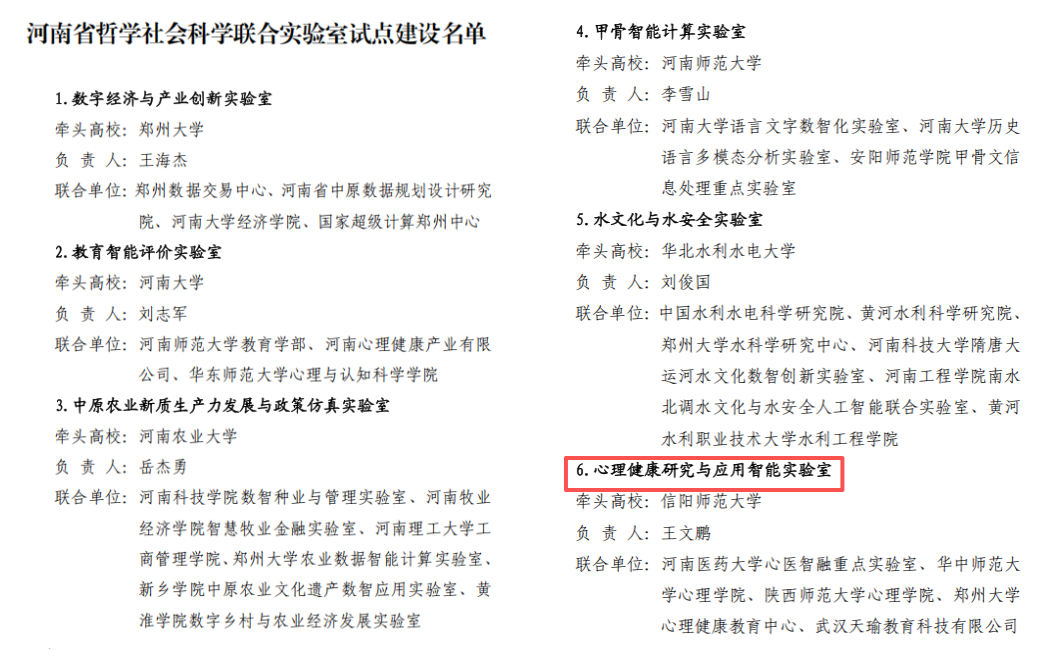 近日,中共河南省委教育工委、河南省教育厅印发通知,我校牵头申报的“心理健康研究与应用智能实验室”,入选河南省哲学社会科学联合实验室试点建设名单,校党委书记王文鹏为实验室负责人。