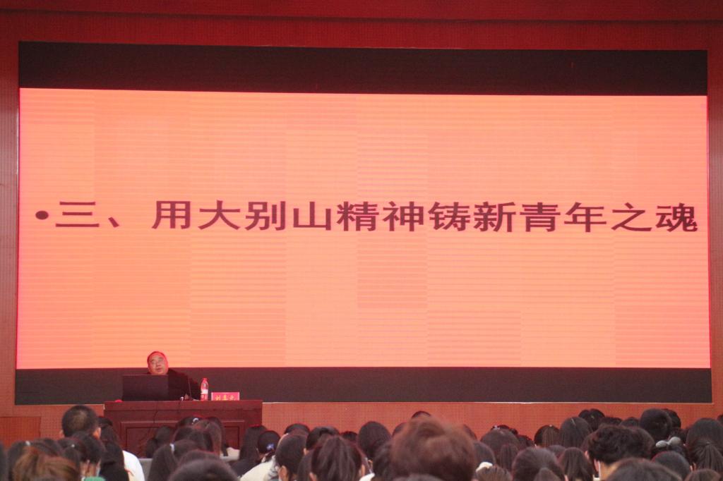 报告会上,刘喜元通过介绍大别山地区多位烈士的英雄事迹,向同学们深刻分析了“坚贞忠诚、牺牲奉献、一心为民、永跟党走”的大别山精神。并以毛主席、周总理的求学经历为例,向同学们阐述什么是新青年之魂,他鼓励全体同学培育和践行社会主义核心价值观,做有理想、有担当的青年人,用奋斗实现青春梦想。他勉励新时代青年学子勤奋学习,增长才干,在激扬青春、开拓人生、奉献社会的进程中书写无愧于时代的壮丽篇章。他精彩讲话深深地感染了现场的每一位同学,赢得现场掌声不断。