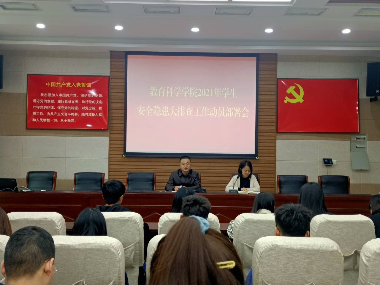 工作前期,教育科学学院党委召开安全部署会议,党委副书记董银银提出三点要求:一是牢固树立安全意识,坚守学生安全底线,紧绷安全防范这根弦;二是明确责任担当,认真贯彻落实上级和学校安全排查工作要求及部署,加强学生管理,切实保障校园安全稳定;三是针对排查出的安全问题,第一时间严格整改,完善相关管理制度,健全风险管控和隐患排查整治的长效机制。