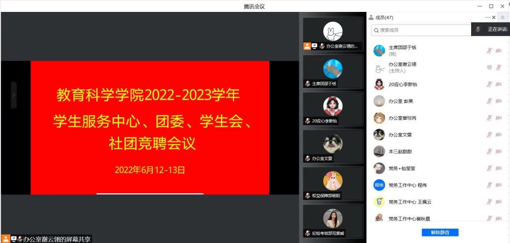 6月13日至6月14日,教育科学学院线上召开2022-2023学年学生服务中心、团委、学生会、社团工作人员竞聘大会。主席团成员、各部门部长、副部长以及此次竞聘人员参加会议。会议由办公室主任谢云翎主持。