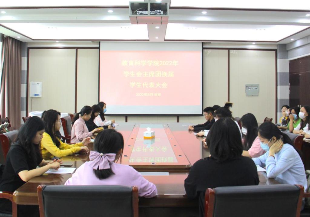 5月18日,教育科学学院2022年度学生代表大会在教科楼402会议室召开。分团委书记牛洁楠、专职辅导员杨艺卓,学生会全体成员以及21级班长团支书参加此次会议,会议由执行主席孙艳慧主持。
