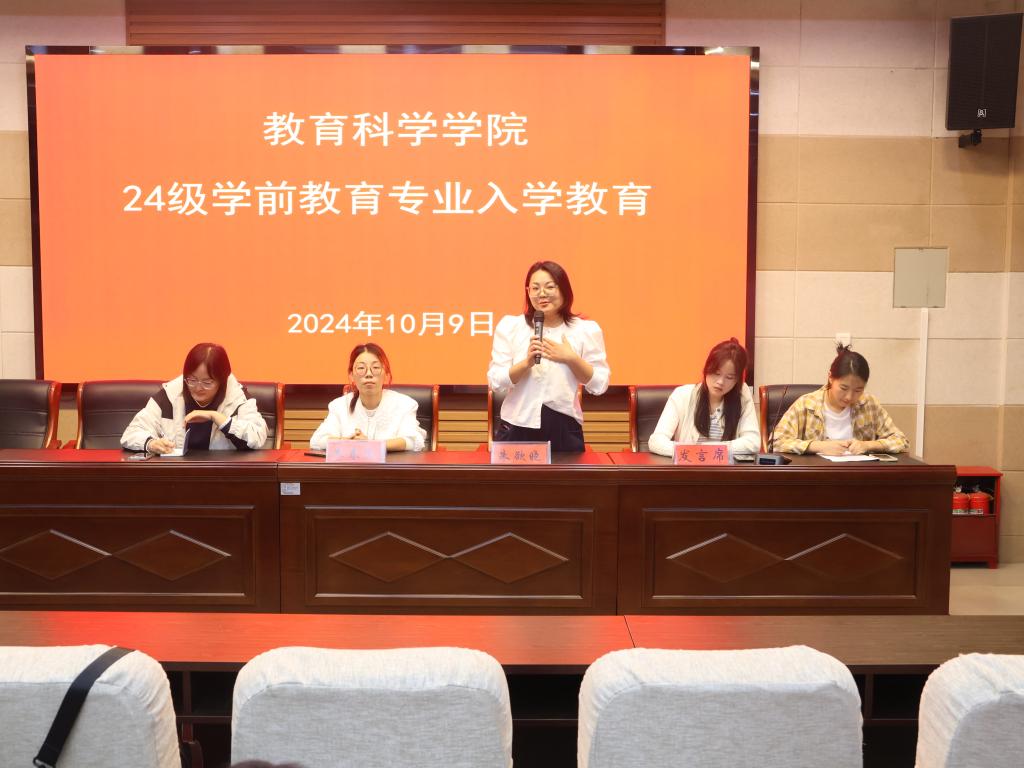 为解答2024级学前教育专业新生对于学前教育专业方面的疑问,10月9日,教育科学学院于教科楼301会议室开展24级学前教育专业入学教育。学前教育系主任朱春蕊、专业课老师朱欲晓、专职辅导员杨艺卓、21级学前教育专业和23级学前教育专业学生代表以及24级学前教育专业全体学生参加会议。