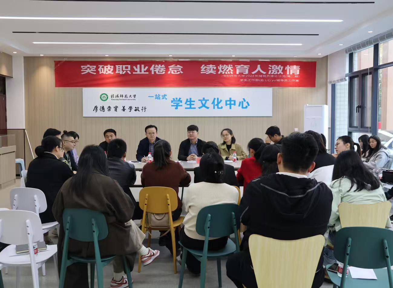 时间:2024-11-14 11:51:55 来源:教科院新闻宣传中心 作者:祐亚菊 蒋璐瑶 阅读: 次11月12日,由学生工作部主办,心yu辅导员工作室承办的辅导员理论沙龙(第二期)在“一站式”学生文化中心举行。本次沙龙邀请教育科学学院副院长、心理学博士孙天义教授作为主讲嘉宾,以“突破职业倦怠,续燃育人激情”为主题做辅导交流,学工部相关负责同志、各学院党委副书记和辅导员代表共20余人参加。