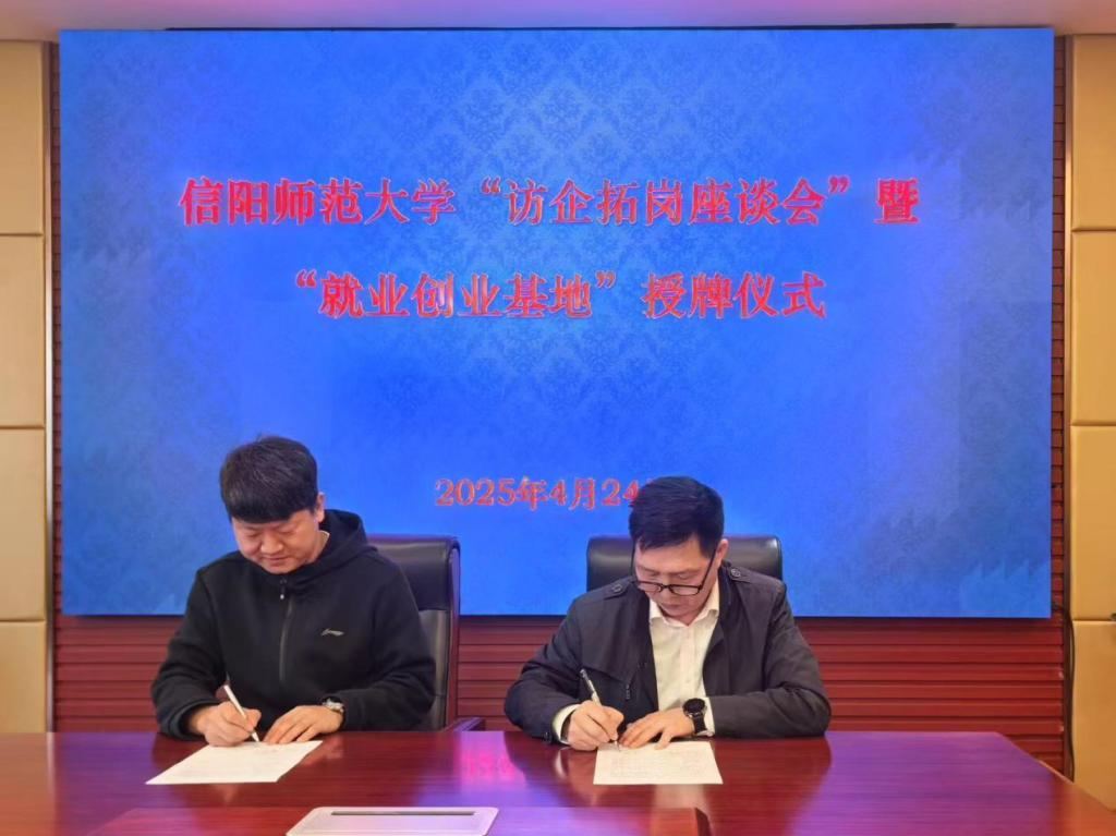 缑星代表学院与信阳同合车轮有限公司人事部经理杨召利签订了合作协议书,房加帅代表学校授予“信阳师范大学就业创业基地”牌匾。
