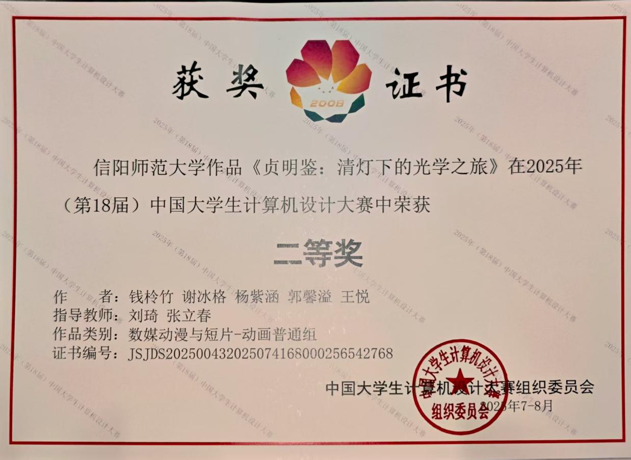 时间:2025-09-02 13:07:21 来源:教科院新闻宣传中心 作者:吴皓 杨泽钰 阅读: 次近日,2025年(第18届)中国大学生计算机设计大赛全国总决赛圆满落幕。我院师生积极参与,组织了两支队伍分别参加不同赛区的角逐。7月22日—26日,由张立春老师带队,前往南京南决赛区参加微课与AI辅助教学类别比赛;8月13日—17日,由刘萱老师带队在南京东决赛区(东北师范大学)参与数媒动漫与短片类别比赛。经过激烈的比拼,我院共斩获二等奖两项、三等奖一项。