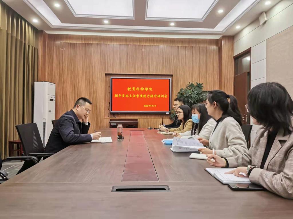 时间:2022-04-03 16:48:47 来源:教科院新闻部 作者:马玉娇 周媛媛 刘至涵 阅读: 次为促进班主任队伍整体工作水平的提升,扎实推进学院各方面工作高质量稳步前进,4月2日,教育科学学院在教科楼会议室召开班主任素质能力提升培训会,院党委副书记董银银与全体班主任(辅导员)参加会议。会议由董银银主持。