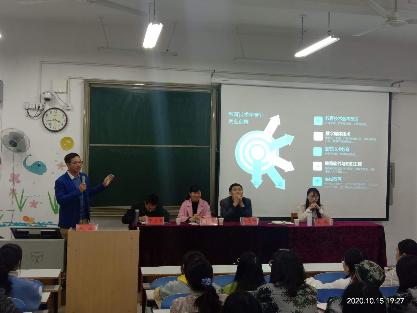 时间:2020-10-16 10:20:15 来源: 作者: 阅读: 次2020年10月15日,信阳师范学院教科院2020级教育技术学班导师见面会在教科楼201教室举行。郑立坤教授 ,刘萱老师,武滨博士 ,宋晔老师,张立春老师参加此次见面会。郑立坤教授首先对教育技术学的简介及发展背景进行了详细的介绍,让新生对自己所学的专业有所了解。刘萱老师将专业培养方案及专业课程向新生进行了讲解,并且列举出很多教育技术学往届优秀的毕业生,让学生真正感受到这个专业的优势和可观的发展。武滨博士就学生比较关心的就业前景进行了细致地解答,将教育技术学专业多元化多领域的就业方向通过形象生动的语言展现给学生。宋晔老师结合自身的学习和经历用,实际例子讲述了教育技术学的就业发展,并且总结了自己上学的经验,给学生留下深刻影响。最后,张立春老师对几位老师的发言进行了详细总结,并且作为2020级教育技术学班的班主任,张立春老师嘱托同学一定要结合自身的情况学会如何去高效率学习,做到一专多能!